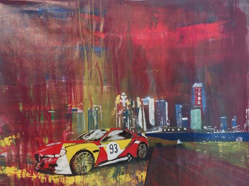 Im Haus Buchenried am Starnberger See sind großformatige Acrygemälde auf tiefem rot entstanden